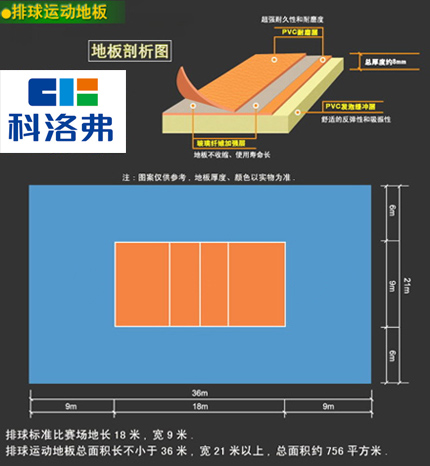 排球運動起源于美國?,F(xiàn)在的排球比賽場地多采用PVC塑膠材質(zhì)的地板鋪設(shè)而成,因為PVC塑膠運動地板的超強的防滑性,十分適合與排球這種運動性高、對地板沖力較大的運動,且PVC塑膠運動地板具有良好的耐磨性以及舒適的反彈性都給運動者帶來了良好的運動體驗。排球運動地板板材規(guī)格通覽: 單卷寬1.5m 卷長18m(線內(nèi)) 面層紋理:牛皮紋/其他 總厚度:8mm/其他 場地線總長寬:18mX9m 地板總長寬:36mX21m 地板總面積:756㎡