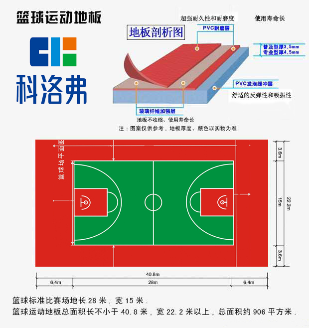 籃球運(yùn)動起源于美國?;@球地板多使用10年至20年間的美國楓木地板鋪設(shè)而成,但是由于其造價昂貴,國內(nèi)多數(shù)場館均采用國產(chǎn)楓木地板鋪設(shè)。近年來,隨著塑膠地板技術(shù)進(jìn)入我國和塑膠地板行業(yè)的興起,籃球塑膠運(yùn)動地板在國內(nèi)已經(jīng)普遍被大眾所接受,因其良好的運(yùn)動特性,深受廣大球員的喜愛?;@球塑膠運(yùn)動地板在國內(nèi)還是一個新型的地板類型,具有很大的發(fā)展空間。籃球運(yùn)動地板板材規(guī)格通覽: 單卷寬1.8m 卷長20m 面層紋理:楓木紋/寶石紋/布紋 總厚度:4.5mm/其他 場地線總長寬:28mX15m 地板總長寬:40mX20m 地板總面積:800㎡
