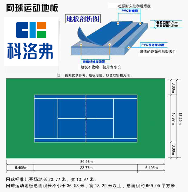 網(wǎng)球運(yùn)動(dòng)最早起源于英國。由于網(wǎng)球運(yùn)動(dòng)的激烈程度對(duì)地板的耐磨性有很高的要求,PVC塑膠運(yùn)動(dòng)地板具有良好的耐磨性及韌性,能夠很好的勝任運(yùn)動(dòng)員對(duì)地板的要求。同時(shí)PVC塑膠運(yùn)動(dòng)地板具有良好的防滑性,能夠是運(yùn)動(dòng)員的競技水平得到極大的提升,同時(shí)由于PVC塑膠運(yùn)動(dòng)地板的良好的減震性能夠很好的保護(hù)運(yùn)動(dòng)員的踝關(guān)節(jié)、膝關(guān)節(jié)等,是運(yùn)動(dòng)員在體驗(yàn)運(yùn)動(dòng)樂趣的同時(shí)能夠很好的保護(hù)自己。 網(wǎng)球運(yùn)動(dòng)地板板材規(guī)格通覽: 單卷寬1.5m/1.8m 卷長20m(線內(nèi)) 面層紋理:荔枝紋/寶石紋/沙地紋 總厚度:3.5mm/4.5mm/其他 顏色:天藍(lán)/草綠 場地線總長寬:23.77mX10.97m 地板總長寬:36.6mX18.3m 地板總面積:669.78㎡