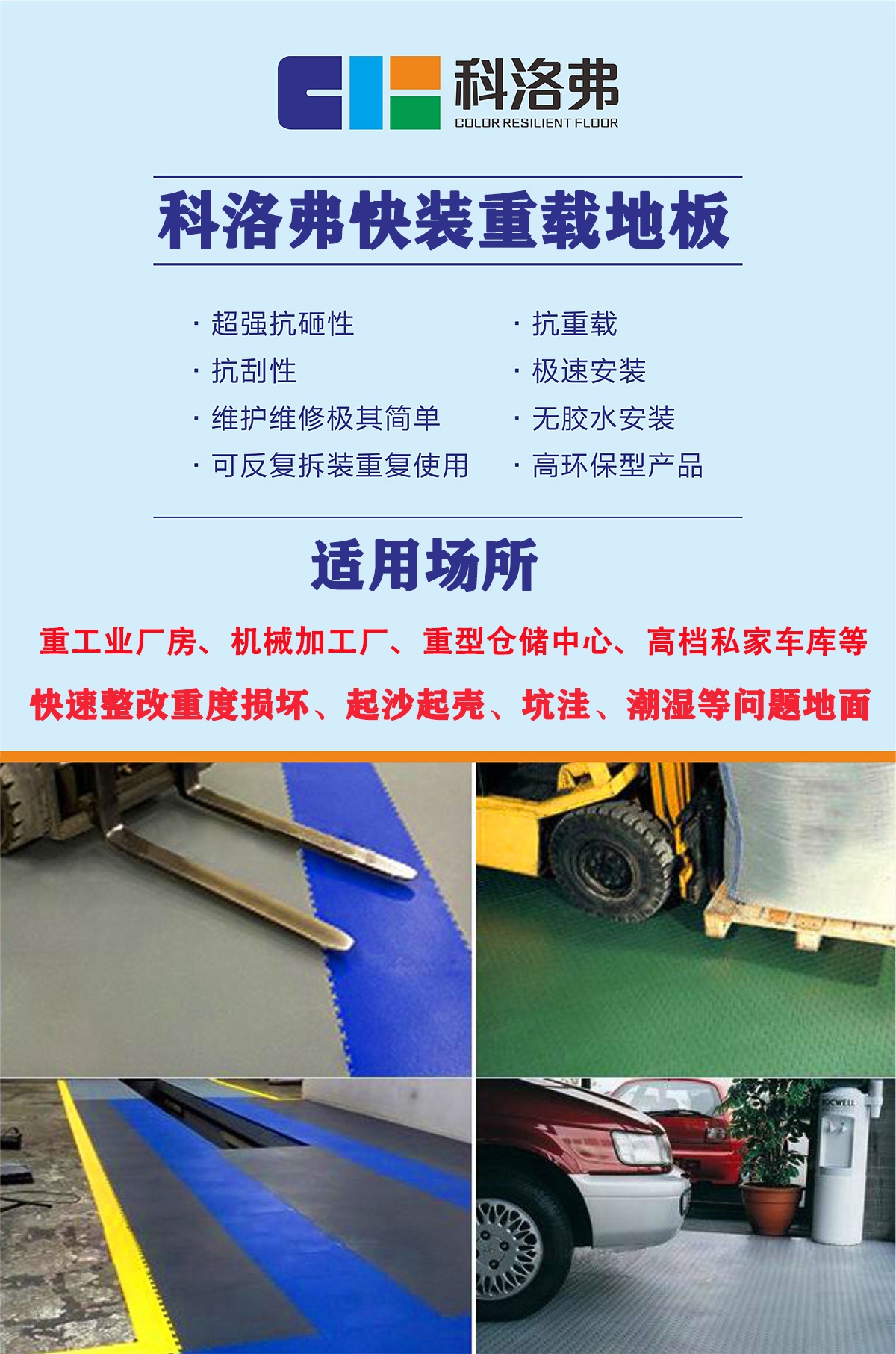 車間地板比較爛怎么辦?爛地面修補(bǔ)翻新多少錢一平米? 車間爛地板坑坑洼洼怎樣修補(bǔ)?針對爛水泥地坪起砂、凹凸不平、裂縫、污漬、腐蝕等進(jìn)行各類舊地面翻新需要哪些材料?科洛弗采用研發(fā)配方先進(jìn)制造技術(shù),專業(yè)生產(chǎn)快裝重載工業(yè)地板,被廣泛使用于工業(yè)廠房車間環(huán)氧樹脂地坪及油漆地面的破損修復(fù)翻新,使用更加靈活高效。重型耐磨、耐重壓、耐承重,讓地面不易磨損。維護(hù)成本低廉,更易維護(hù),磨損破損工廠地面及倉庫地面更易修補(bǔ),局部維護(hù)更加便捷方便