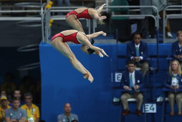 女子雙人三米板決賽中,中國(guó)選手吳敏霞和施廷懋以345.60分的總成績(jī)奪得冠軍,中國(guó)獲第二枚金牌。