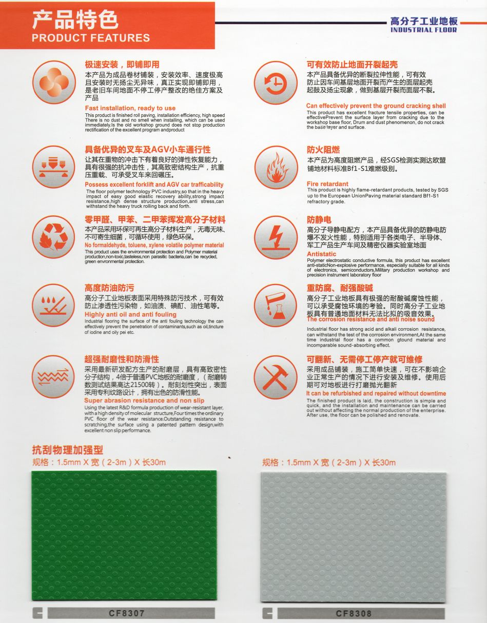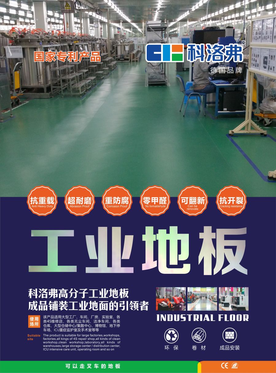 科洛弗高分子工業(yè)地板是一種采用高分子改性樹脂為原材料通過高溫?zé)釅撼尚偷牡匕?,此地板具備防油性、抗污性、抗腐蝕、防水防潮、施工工期短維修簡單、耐磨性好、抗靜電、重載、能過叉車、環(huán)保無毒、可回收再利用等優(yōu)點!此產(chǎn)品的出現(xiàn)正好填補了市場快速發(fā)展帶來的空白,各項性能指標均衡且優(yōu)異,可以逐步替代部份原有環(huán)氧地坪及各類水泥面工業(yè)地面,應(yīng)用將逐漸增大,市場前景廣闊。